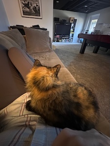 We have had a few neighborhood cats come around since we moved here. Most are skittish and run away if we show up. But one cat was different. She was so friendly that we were pretty sure she belonged to someone and had escaped. Carolyn began putting out food for her and eventually she started to trust us and come into our basement to eat. We then kept her inside and she warmed up to us quickly, purring and playing and happy to hang out. Carolyn posted photos of her on the neighborhood Facebook group but no one knew her. We took her to our vet (where we gave her the name Jane Doe) and we learned that she was neutered but not chipped. We decided to try to find someone to adopt her. Carolyn’s colleague at the park library mentioned that his daughter was looking for a cat, so after a few calls and FaceTimes, Rick packed Jane Doe up and took her to Toledo to make the transfer. She was renamed Soup and now has her forever home. Success!
