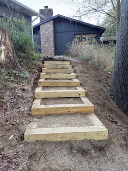 We have been slowly making changes to the outside of our home. Carolyn replaced our backyard with Ohio native plants. Other areas got some landscaping love. Erin came up to help Rick install wood stairs where the gravel ramp was behind our house. Caroln and Rick cut the posts for the steps but Erin did all of the hard work and the result was great. These steps make it so much easier to access the back patio.
