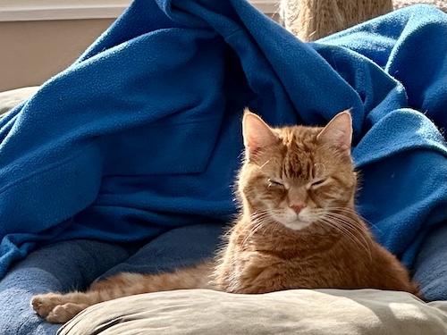 He spent hours on the catio basking in the sun. He watched cat and bird videos attentively. He wrestled with brother Leo and groomed sister Cassie. He was loving and happy and playful and cozy and beautiful.