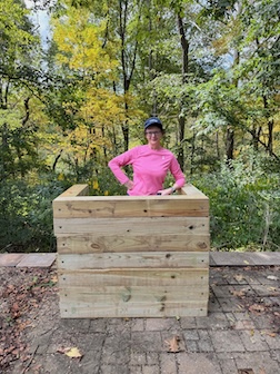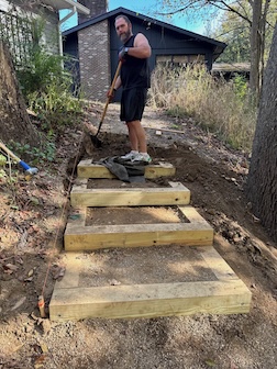 We have been slowly making changes to the outside of our home. Carolyn replaced our backyard with Ohio native plants. Other areas got some landscaping love. Erin came up to help Rick install wood stairs where the gravel ramp was behind our house. Caroln and Rick cut the posts for the steps but Erin did all of the hard work and the result was great. These steps make it so much easier to access the back patio.
